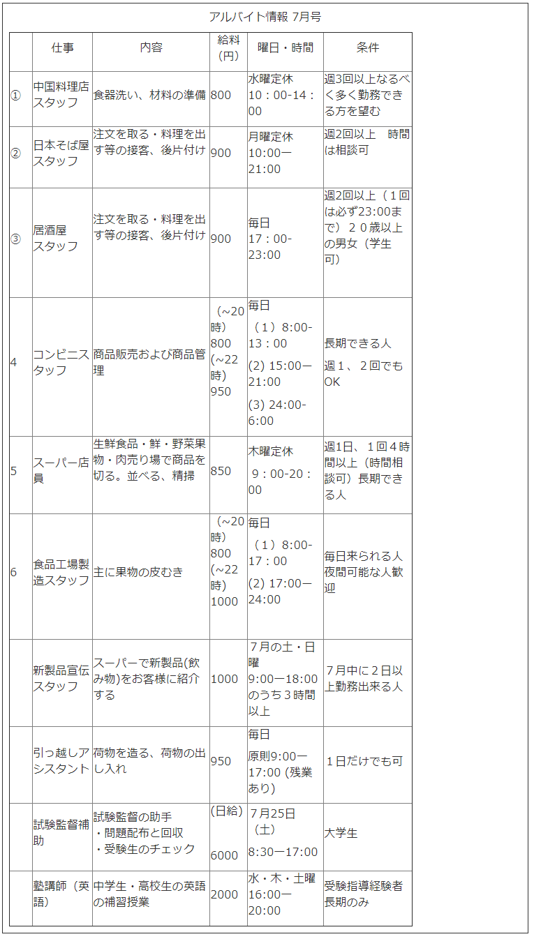 2.大学生の山田さんは夏休みの旅行の費用が少し足りないので、7月に1日か2日だけアルバイトをしたいと考えている。山田さんが応募できる仕事はいくつあるか。