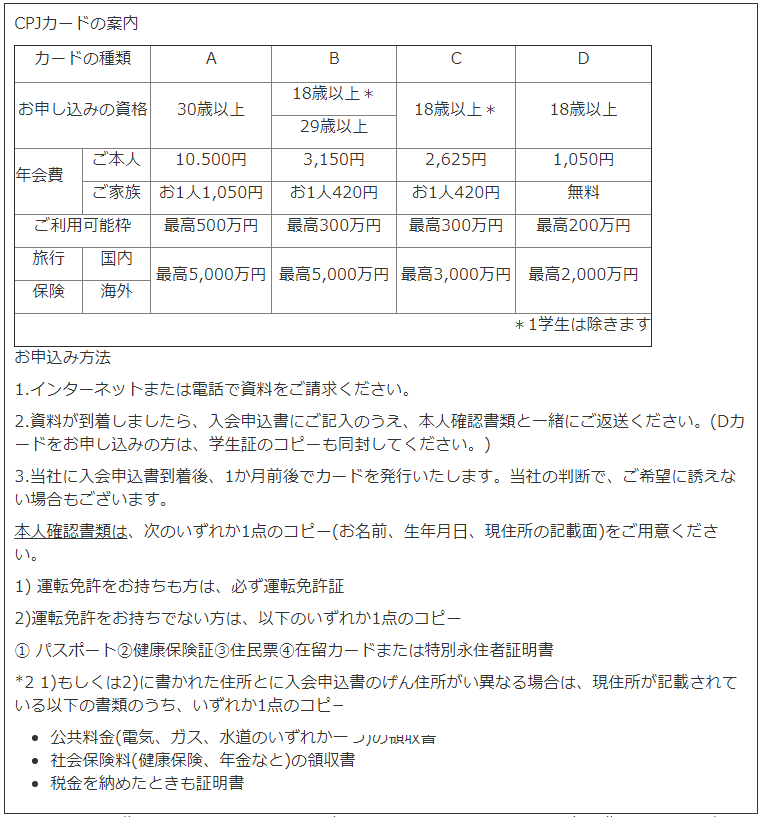 1.中西さんは35歳の会社員で、CPJカードを申し込むことにした。中西さんは年会費を5000円以内に抑えたいが、海外旅行の保険はなるべく高額なものがよい。中西さんに最も合っているカードはどれか。
