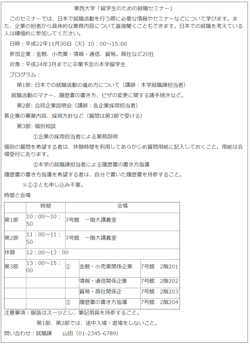 1.留学生のリーさんは、日本のコンピュータ関連の企業への就職を希望している。このセミナーでは企業の採用担当者に質問をしたいと思っている。リーさんはBどうすればいいか。 A. 個別相談の申し込みをしたうえで、11:00に7号館の1階大講義室に行く。