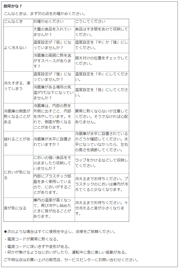 2.この冷蔵庫の使用中にすぐに使うのをやめて販売店などに故障かどうか調べてもらったほうがいいのは、次のうちのどれか。 A. 冷蔵庫から食品のにおいがもれてくる。