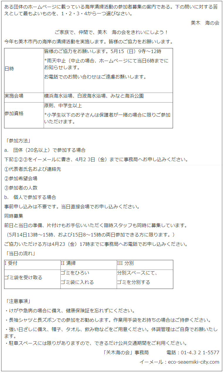 1.オーリャさんと山下さんの二人は臨時スタッフになって、海岸清掃活動に参加したいと思っている。二人はどうしなければならないか。 A. 4月23日までEメールで申し込む。