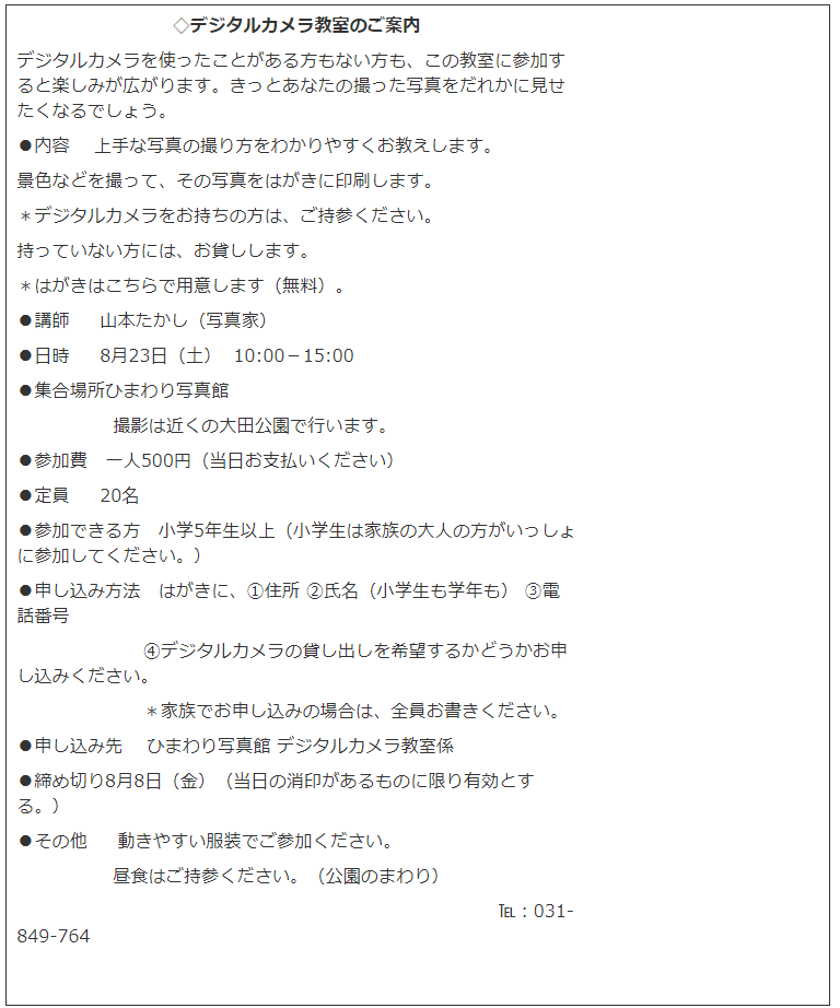 D. デジタルカメラ教室への参加を申し込みます。 ①中川市大田 2-5-1 ②小林一郎(6年生) ③031-49-8713 ④カメラを借ります