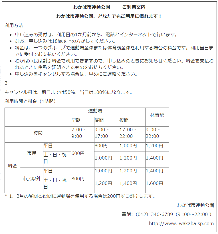 1.チャンさんは、わかば市運動公園の運動場で、友達とサッカーをしたいと考えている。2月11日の日曜日、午前10時から午後2時まで利用したい。チャンさんも友達もわかば市民ではない場合、1時間の利用料金はいくらか。 A. 800円