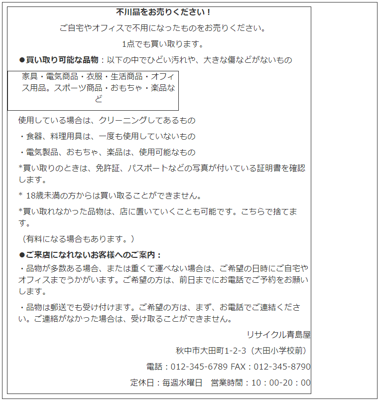 2.この店に不用品を売るとき、必ずしなければならないことは何か。 A. 品物を売る場合は、自分で品物を店まで運ぶ。