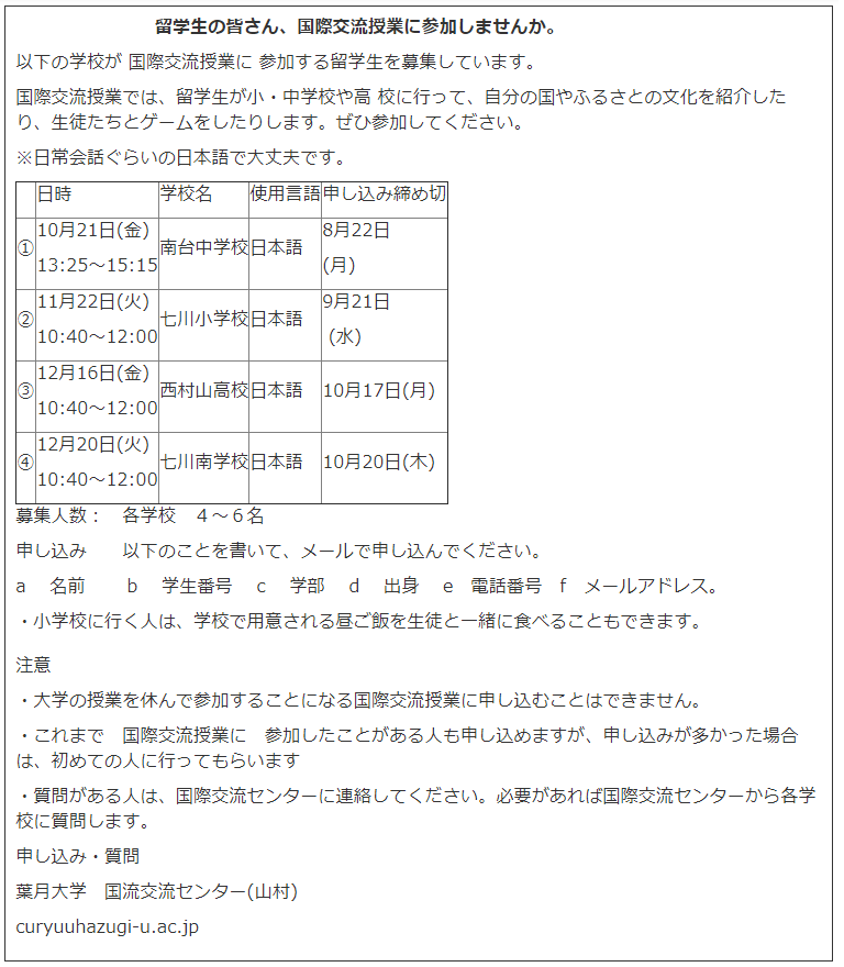 C. これまでに国際交流授業に参加したことがある人は申し込むことができない。