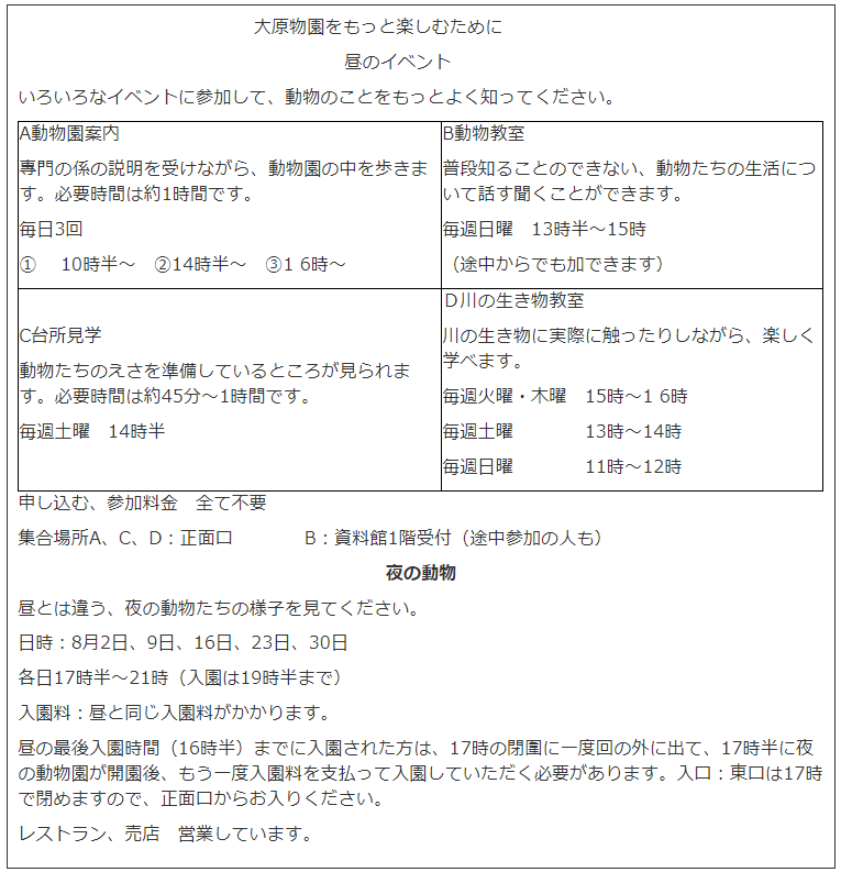 2.カクさんは8月9日の昼に動物園に来て、園内でポスターを見て、その日の「夜の動物園」を見るために、カクさんがしなければならないことはどれか。 A. 17時半までに、もう一度入園する。