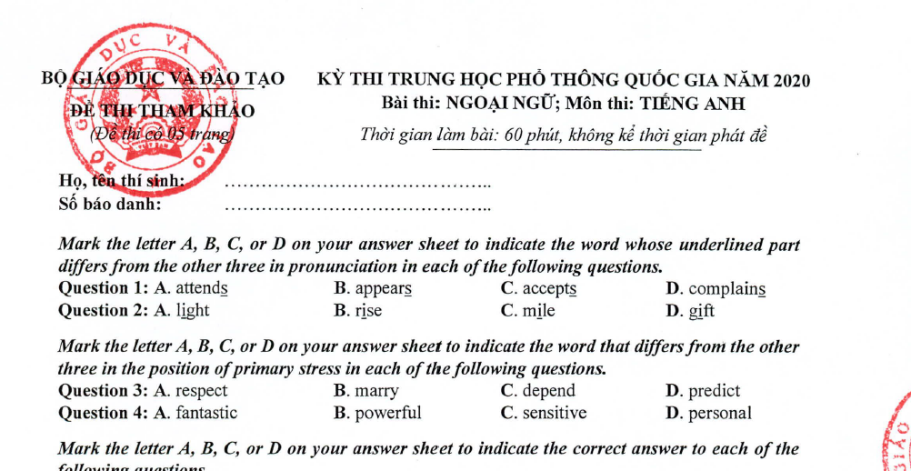 [TIẾNG ANH] Đề thi minh họa THPT Quốc gia 2020 MÔN TIẾNG ANH...